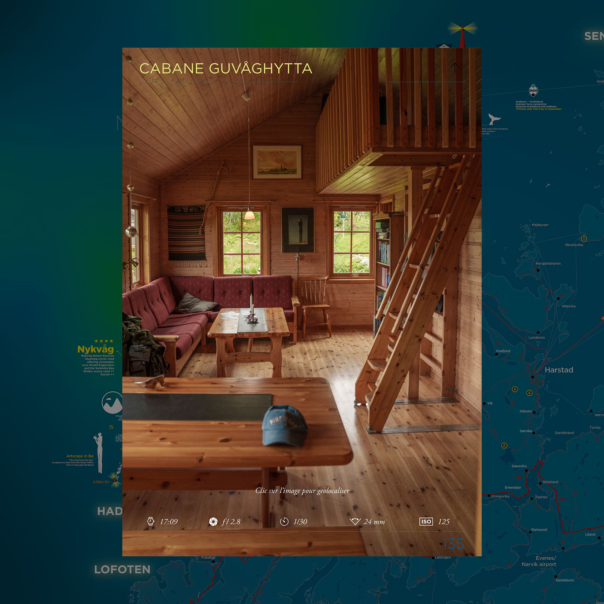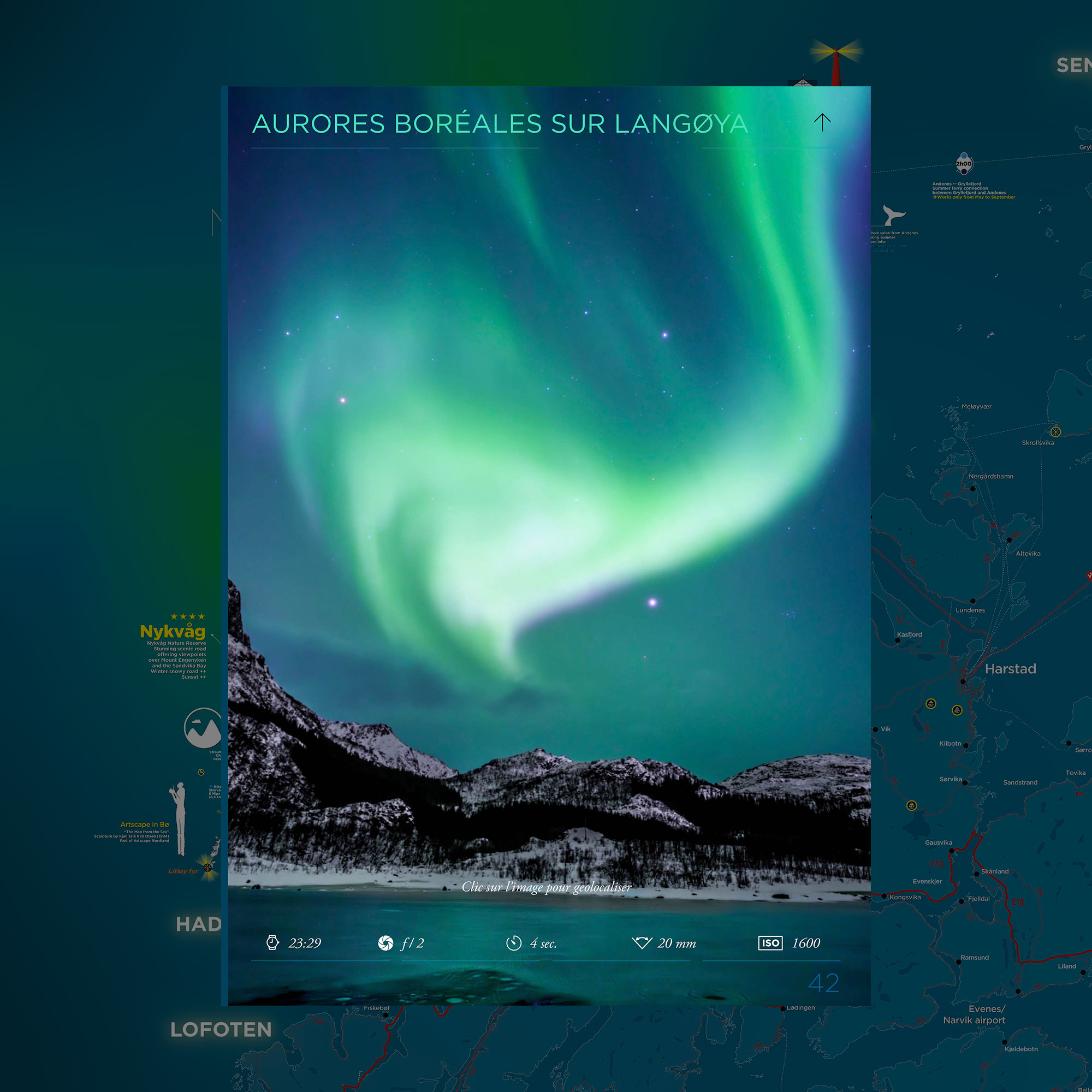 Tu retrouveras les zones d’intérêt photographique des îles Vesterålen , (montagnes, fjords, phares, monuments, faune, flore et curiosités…) mais elle va bien au-delà !