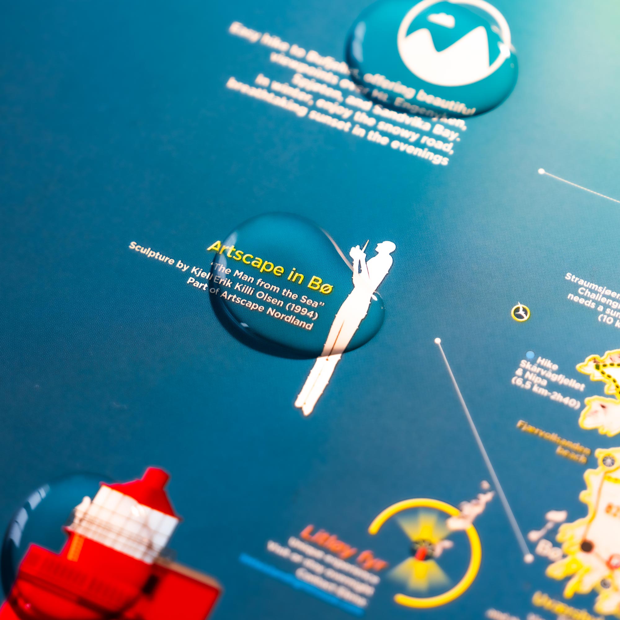 Cette carte des îles Vesterålen est imprimée sur un large format (100 x 70 cm), celui-ci vous permet d’observer d’un seul coup d’œil l’ensemble des informations disponibles. Les must see**** et les cercles de couleur jaune te guident instantanément vers les lieux à ne pas manquer.